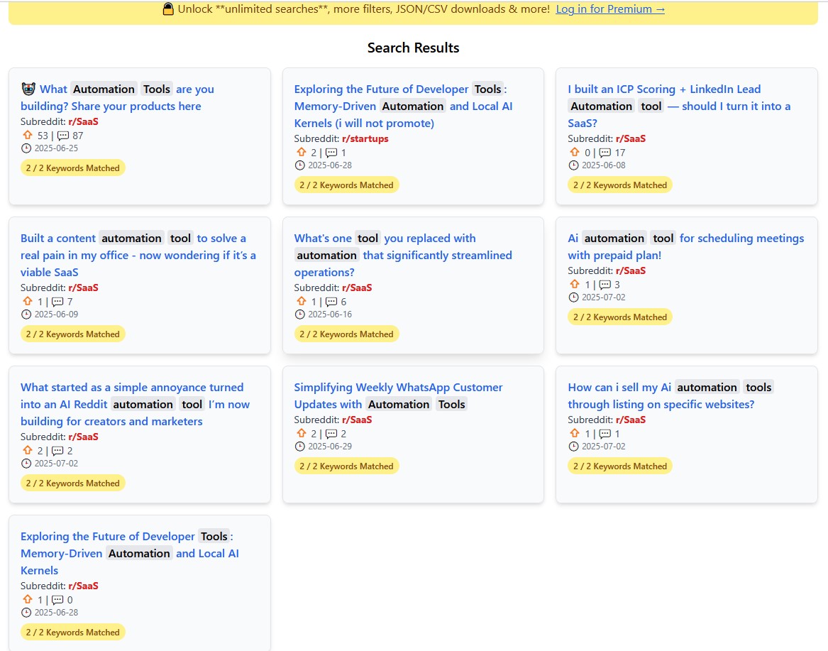 Keywords: "automation", "tools", "AI", "workflow"Monitor trends across multiple relevant subreddits simultaneously. Compare discussions in r/SaaS, r/startups, r/entrepreneur, and more in one unified view.